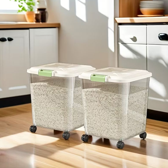 This rice barrel with wheels is a practical and space saving storage solution designed to keep rice and grains fresh, clean, and easily accessible. made with a transparent body, it allows you to see the quantity at a glance while the sealed lid helps protect contents from moisture, dust, and insects. the smooth rolling wheels make it easy to move around the kitchen without heavy lifting, while this rice basket allows convenient washing and draining before cooking. durable, hygienic, and multifunctional, this rice storage organizer is perfect for storing rice, flour, pulses, and other dry foods in an organized and efficient way.
