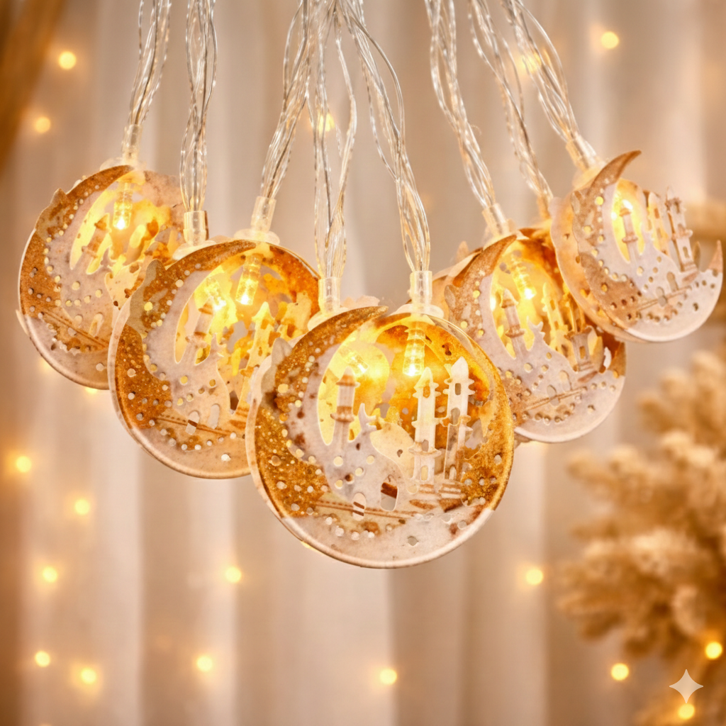 This mosque shape led string lights designed to add a festive and spiritual touch to ramadan celebrations, featuring beautifully crafted mosque-shaped bulbs that glow warmly when lit. battery operated for convenient placement anywhere without the need for outlets, these fairy lights are perfect for decorating windows, walls, tables, or outdoor spaces during iftar gatherings and family events. lightweight, easy to hang, and durable, they create a cheerful and enchanting ambiance, making your ramadan decor both beautiful and practical.