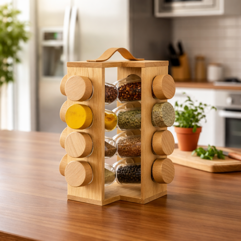 This rotatable wooden spice jar with handle is a practical and elegant kitchen storage organizer designed to keep your masala and spices neatly arranged and easily accessible. crafted from durable wood, the sturdy stand rotates smoothly, allowing quick selection while cooking, and features a convenient top handle for easy movement. the transparent spice jars make it simple to identify contents at a glance while keeping spices fresh and organized. perfect for everyday kitchen use, this spice jar stand saves counter space, reduces clutter, and adds a warm, modern touch to your kitchen décor.