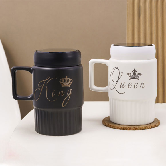 This king queen ceramic coffee mug with mirror lid is made from quality ceramic and designed with a stylish king and queen theme. it comes with a unique mirror finish lid that helps keep drinks warm and adds an elegant look. suitable for coffee, tea, or milk, perfect for couples, home or office use, and a great gift option.