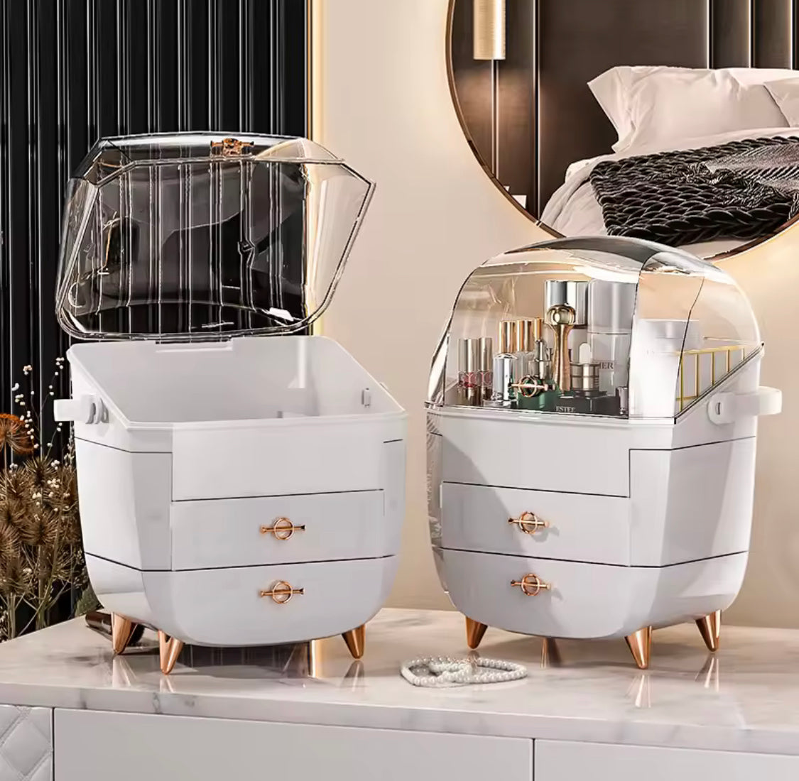 This multi compartments cosmetic organizer is a stylish and practical solution for keeping your beauty essentials neatly arranged and easily accessible. designed with multiple layers and smooth-gliding drawers, this makeup organizer storage box with drawers provides dedicated space for lipsticks, foundations, brushes, skincare products, and everyday accessories. its multi layer vanity countertop design maximizes vertical storage while saving space, making it perfect for dressers or vanity tables. crafted from durable and easy-to-clean materials, this jewelry container box also keeps earrings, rings, and small accessories organized, dust-free, and beautifully displayed, adding both elegance and functionality to your daily routine.